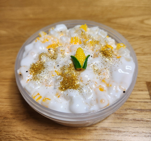 다짐으로부터 한 달 하고도 이틀 뒤, 드디어 상상만 했던 슬라임이 내 책상 위에 도착했다. 떨리는 마음으로 연 상자에는 일곱 종류의 슬라임이 담겨 있었다. 나는 마치 중요한 의식을 진행하듯이 손을 깨끗이 씻고, 꼼꼼히 핸드크림을 발랐다. 그리고 가장 기대했던 슬라임 하나를 꺼냈다. 매끈한 하얀 바탕에 노란색과 흰색의 새끼손톱만 한 블록들이 섞여 있었다. 작은 블록이 옥수수 알갱이 같은 녀석의 이름은 '콘 샐러드 콰작'. 뚜껑을 열자마자 이름처럼 달콤하고 고소한 옥수수 냄새가 진동했다. 먹음직스러운 냄새에 이끌려 하얀 반죽을 꼬집듯이 비틀었다. 꾸덕꾸덕한 녀석은 손가락에 따라붙는 것 같다가도 곧바로 떨어져 나갔다. 분명 그토록 원했던 감촉인데, 낯설고 생소했다. 왠지 금지된 것에 손을 댄 것 같은 이상한 기분. 마치 튀김 반죽에 손을 넣었다가 혼이 난 어린아이처럼 주눅이 들었다.