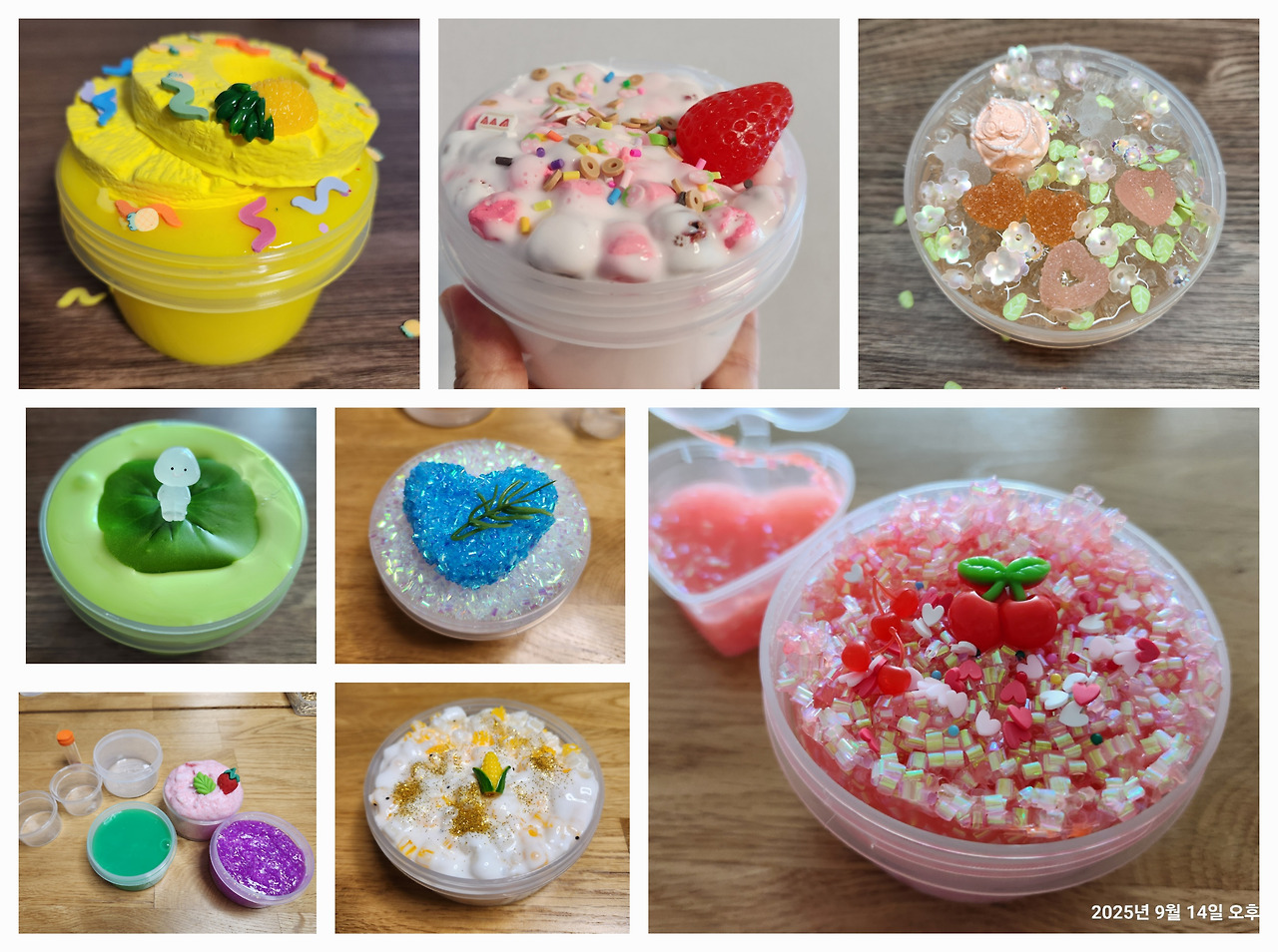 하는 수 없이 영상으로 아쉬움을 달래던 어느 날, 볼 일이 있어 다이소에 들렀다. 이곳저곳을 기웃거리다, 운명처럼 마주쳤다. 자그마한 플라스틱 통에 화려한 색감으로 담겨 있는 네 종류의 슬라임을. 가격은 단돈 이천 원!