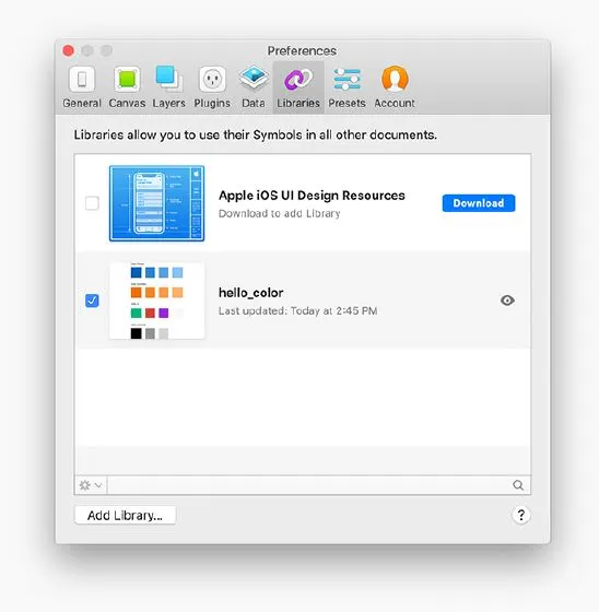 색상 문서를 라이브러리로 전환하는 방법은Sketch > Preferences > Add Library > 라이브러리 문서 선택위의 예제를 사용하여 hello_color 문서를 첫 번째 라이브러리로 만들었습니다.