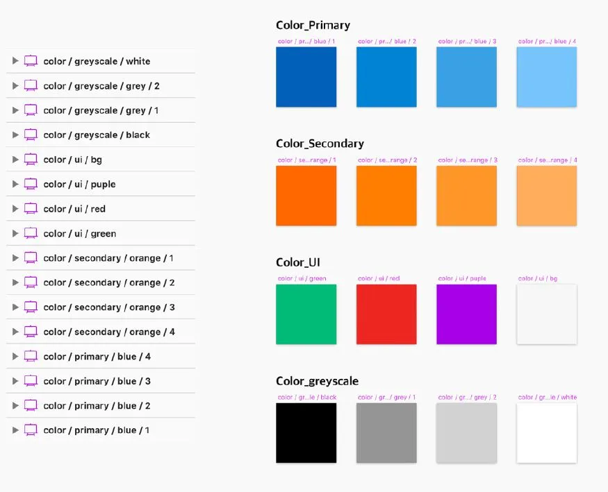 라이브러리 디자인 시스템의 각 색상에 대한 스타일을 만들어 범주로는 primary, secondary, greyscale를 사용했고 색상 구조를 나누는 표기 방식으로는 ‘/’ 사용했습니다.