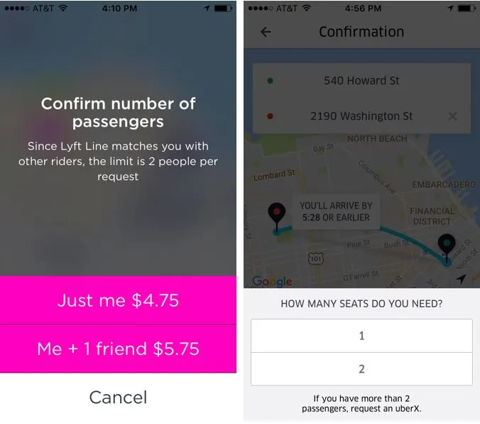 이 두 화면은 Lyft와 uber의 화면으로, 호출할 차량에 몇 명이 타게 되는지 동일한 상황의 화면입니다.