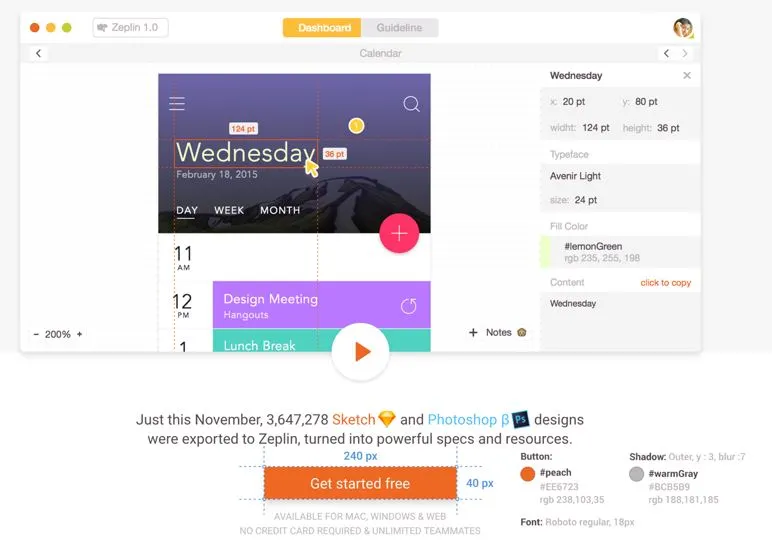 제플린(Zeplin)은 디자이너 및 개발자를 위한 공동 작업 응용 프로그램입니다. 제플린은 스케치 또는 포토샵과 연동하여 자동으로 작업한 결과물을 이미지 파일 Asset과 디자인 가이드로 생성해 줍니다.