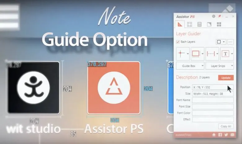 저 또한 어시스터 PS 출시 후 디자인 가이드를 작업할 때 종종 어시스터 PS를 많이 애용했습니다. 포토샵과 연동하면 좌표값, 가이드 박스, 크기 값을 자동으로 생성하여 추출할 수 있었습니다.