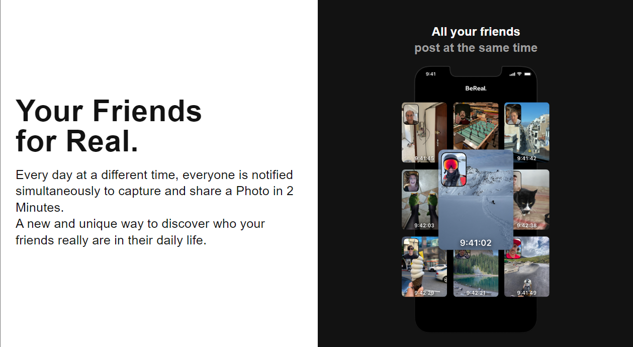 내 사진을 올리지 않으면 내 친구들 사진이나 다른 사용자들의 게시물을 볼 수 없는데, 나중에라도 사진을 올리면 게시물들을 다시 볼 수 있도록 하여 사진 업로드를 유도하고 있다. 또한, 내 친구들뿐만 아니라 전 세계에서 올라온 사진도 볼 수 있다. 불특정 다수의 게시글이라 부담 없이 볼 수 있고 타인의 솔직한 일상을 보며 기존 SNS와는 다르게 비교 의식 없이 즐길 수 있다.