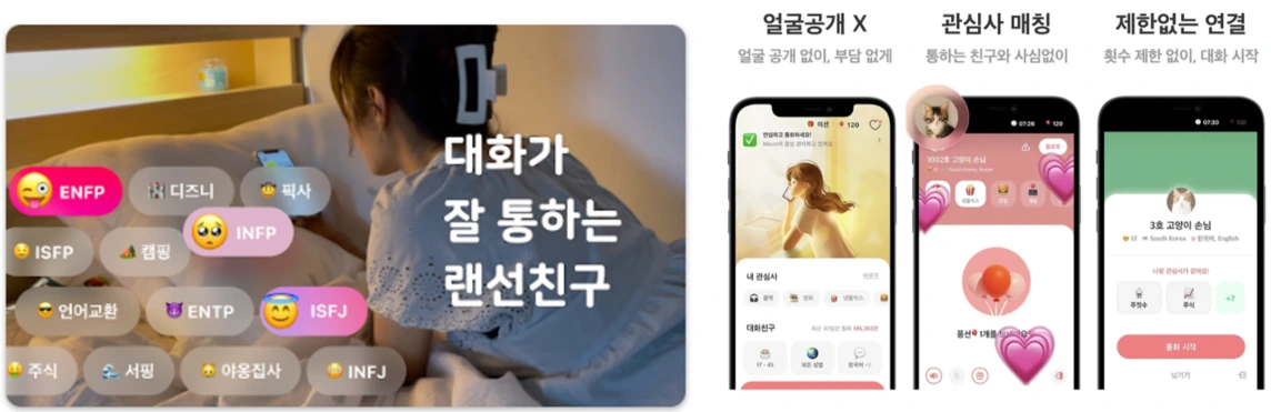 진정성 있는 대화를 위해 얼굴 없이 익명으로 참여하는 것이 가장 큰 특징이다. 상대방의 얼굴이나 프로필 조건을 바탕으로 기준을 잡고 평가하는 것이 아닌 마음이 통하는 사람과의 관계 맺음에 집중하게 하는 서비스다.