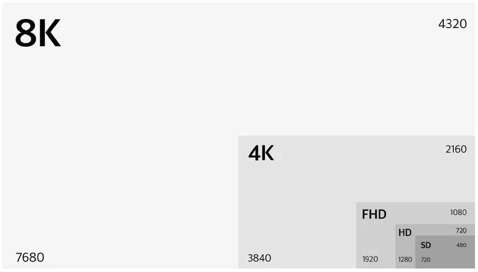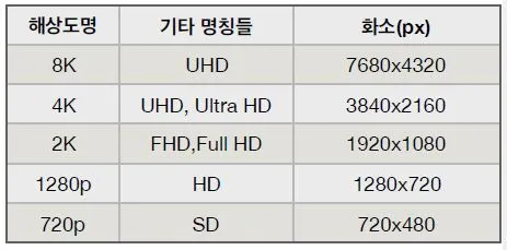 TV 시장에서 광고하는 QLED 혹은 OLED라는 용어는 디스플레이 구현 기술을 말하며, 현재는 8K라 불리는 해상도가 가장 높은 해상도입니다.