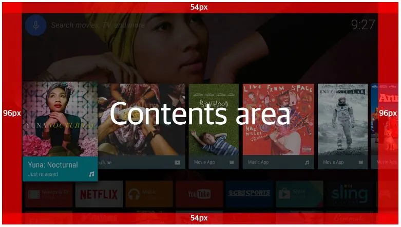 Android TV는 최소 5%의 마진을 설정, 전체 영역의 90%내에 콘텐츠를 배치함