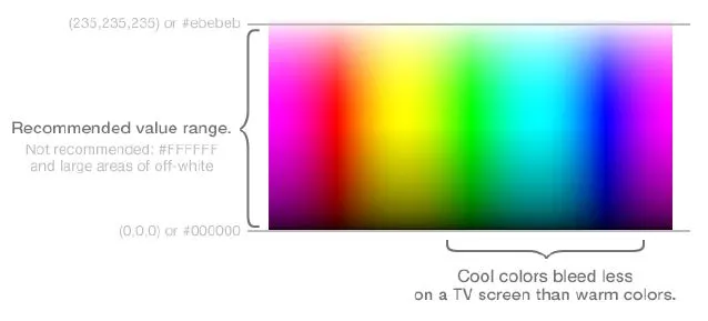 화이트 컬러를 쓸 때 주의해야 점은 Pure White(#ffffff)는 사용하지 않도록 해야 합니다. 화이트는 특히 TV에서 더 밝게 보이기 때문입니다.