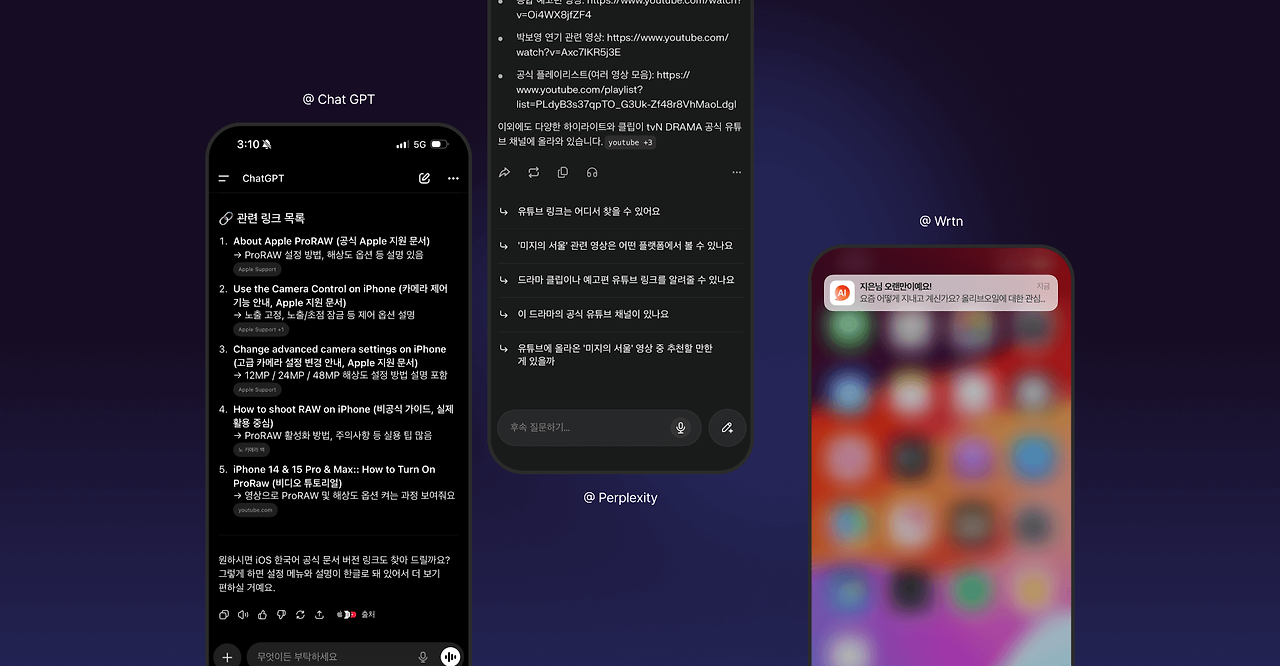 Wrtn (능동형 선제 제안) 사용자가 AI를 호출하지 않아도 “오늘은 어땠어요?” “지난번에 찾던 영화 개봉했어요.”처럼 먼저 말을 겁니다.