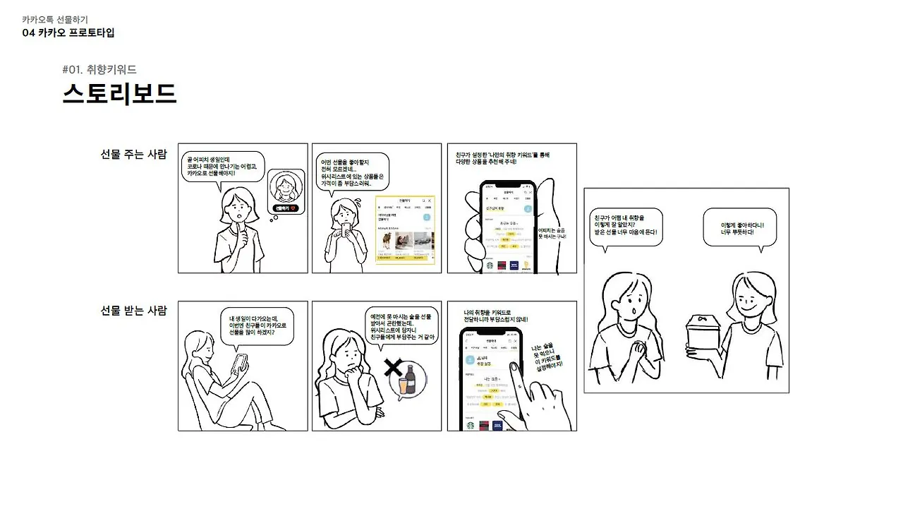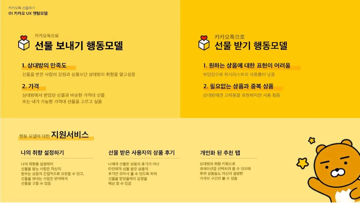 14기 카카오톡 선물하기조에서는 최근 커머스에서 선물하기 기능을 추가하고 있는 추세 속에 선두 플랫폼인 카카오만의 장점을 더욱 강조하여 최대의 개선효과를 볼 수 있는 UX 솔루션을 고민했다고 합니다.
