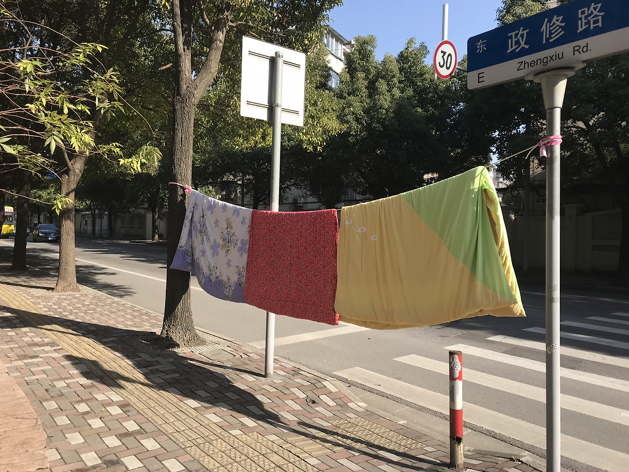 이런 의아함이 제일 커지는 순간은 맑은 날 찾아온다. 볕이 좋은 날 상하이는 집집마다 빨래를 창밖 건조대에 널어놓는 장관이 연출된다. 건물의 외벽은 온갖 색상의 이불과 속옷, 옷가지들이 긴 장대에 꼬치구이처럼 걸려 펄럭거린다. 이곳 사람들은 마음만 먹으면 옆집 사람이 어떤 속옷을 입고 어떤 이불을 덮었는지 확인할 수 있는 것이다.