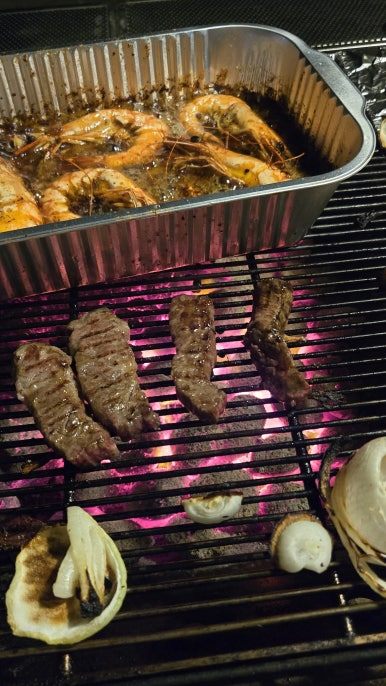 불판 구석에는 하나로마트에서 감바스용으로 구매한 은박접시를 올려두었다. 여러 레시피를 열심히 참고해서 만든 감바스였는데, 일행이 맛있게 먹어주어서 다행이었다. 감바스를 먹고 남은 양념에는 타이거새우를 통째로 넣어서 튀겨 먹었는데, 이 또한 반응이 아주 좋았다. 내가 먹기에도 껍질채로 바삭하게 잘 튀겨졌고, 페퍼론치노의 매콤한 맛도 가미되어서 아주 맛있었다. 기름이 잔뜩 배어서 아주 칼로리 폭탄이었겠지만, 미래의 내가 운동으로 소모해줄것이라 믿고 열심히 먹었다.