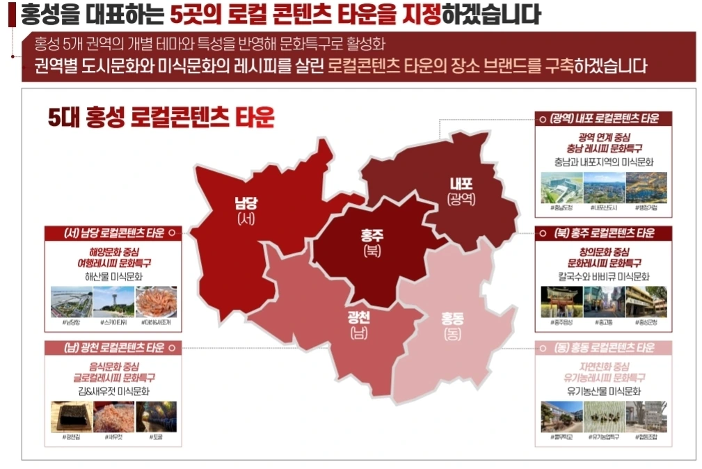 문화도시 사업으로 로컬 콘텐츠 타운을 추진하는 지자체가 있다. 바로 '유기적人 문화도시'라는 컨셉을 제안하는 홍성군이다. 사업 내용으로는 'K-문화레시피 특구, 홍성 로컬콘텐츠 타운' 조성을 앵커사업으로 삼아, 5개의 로컬 콘텐츠타운을 구축하고 유기적인 자립생태계를 만들어갈 계획이다. 이를 통해 지역의 문화자원, 먹거리, 생산물 등을 K-문화레시피로 개발하고, 15분 문화생활권을 조성하여 사회경제적 효과를 창출하고자 한다.
