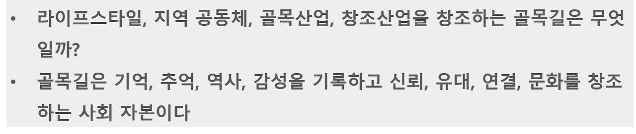 아마도 우리에게 골목길이 가장 소중한 이유는 골목길의 정체성과 진정성 아닐까요? 걷기 좋고 상업 시설만이 매력적인 골목길을 만든다면 골목길은 임의적으로 조성할 수 있을 것입니다.