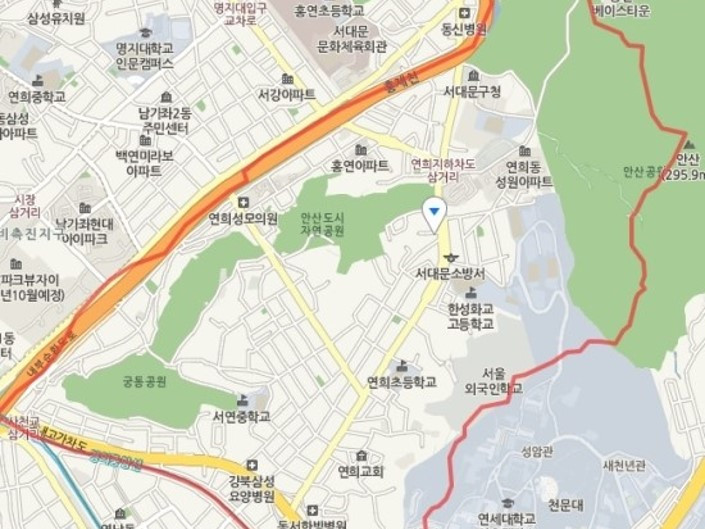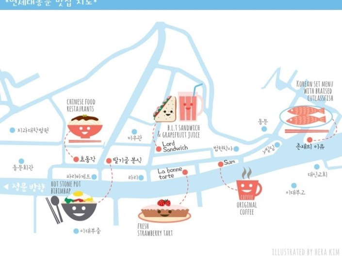 무슨 일이 일어난 걸까요? 동문 지역은 마치 고립된 섬처럼 산(안산), 고가(봉원고가차로), 대형 건물(세브란스빌딩, 연세대와 이대 캠퍼스)로 둘러싸여 다른 지역의 유동인구가 넘어오기 힘듭니다. 빌딩 위주의 상가 구성은 아기자기한 골목 가계의 진입을 어렵게 만들었습니다.
