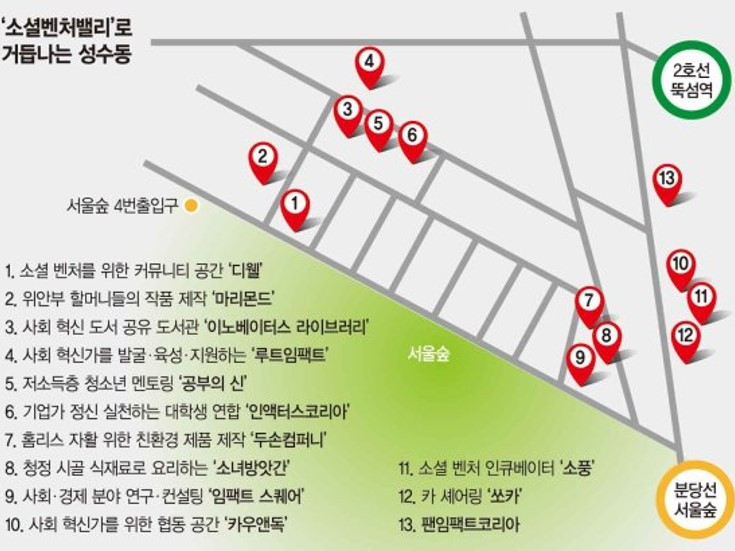 그래도 조금씩 변화하고 있습니다. 열정도 청년장사꾼, 장진우 기업 등 골목길 기획사가 학교를 운영 골목길 창업 인력을 배출합니다. 벤처캐피털과 같은 방식의 지원 기관도 보이기 시작했습니다. 성수동에서 창업하는 음식점, 소품, 디자인 기업을 지원하는 카우앤도그, 루트임팩트와 같은 소셜벤처 지원 기관입니다.