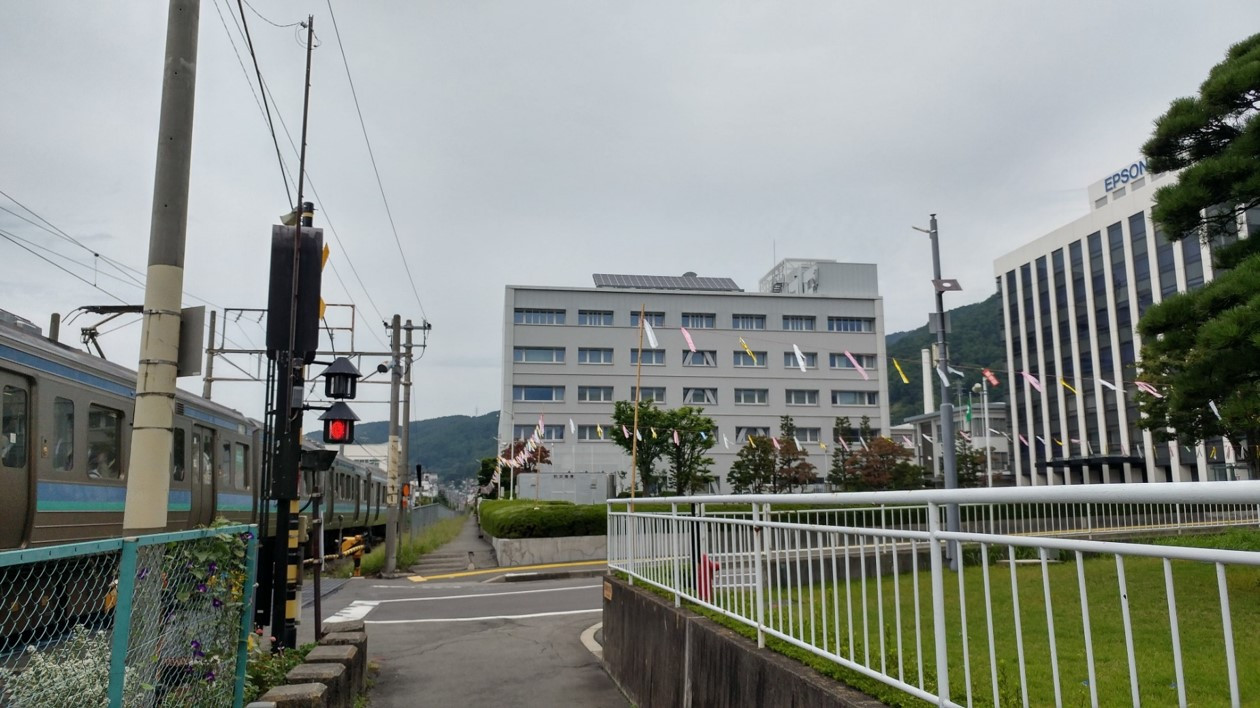 스와 호수에서 골목길을 따라 100미터 들어가면 기찻길 너머로 큰 빌딩 2개가 나타납니다. 프린터와 시계와 유명한 세계적인 하이테크 기업 세이코 엡손의 본사입니다. 코스코스가 핀 기찻길 옆에서 글로벌 기업의 본사를 찾은 셈이죠. 기찻길 옆 오막살이가 아니고요.