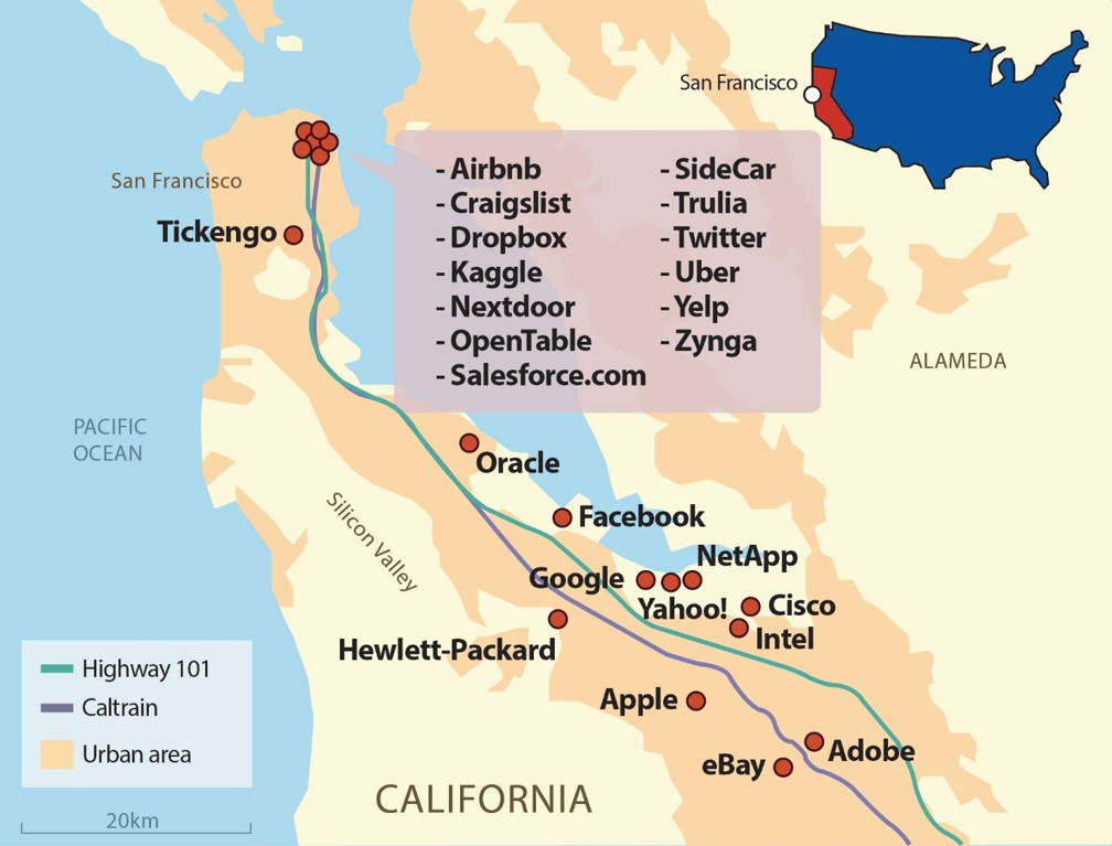 실리콘밸리의 중심이 전원적인 팔로알토에서 샌프란시스코 도심으로 이동하고 있습니다. 핀터레스트 등 일부 기업은 본사를 실리콘밸리에서 샌프란시스코로 옮겼습니다.