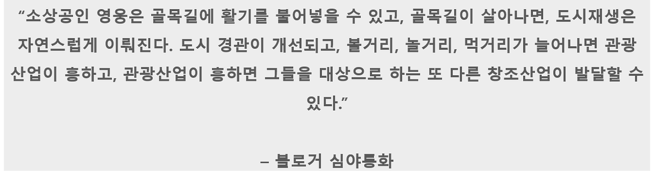 이제 우리가 할 일은 소중하고 가치 있는 골목길을 지키고 발전시키는 일입니다. 성공하는 골목길을 많이 만드는 것이 도시의 일입니다.