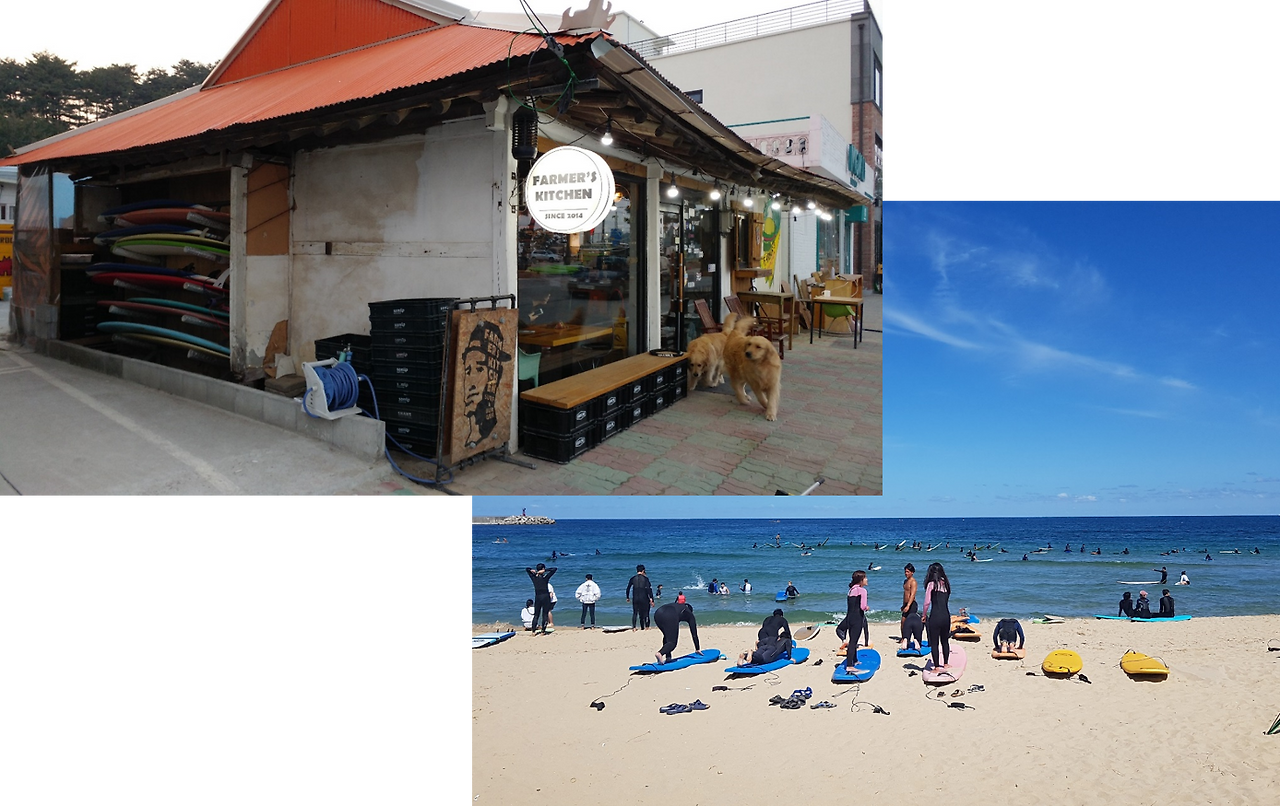 죽도해변은 해마다 늘어나는 서퍼들과 그들을 위한 숙박시설, 상업시설이 어우러져 하나의 공동체를 이룹니다. 사람이 모여 살면서 자연스럽게 골목상권이 형성됐습니다.