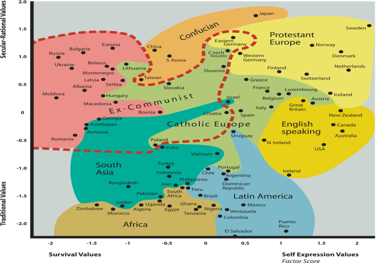 일본은 자기표현 가치에서 북유럽 수준에 진입한 반면, 한국은 개도국 수준의 집단주의에 머물러 있습니다.