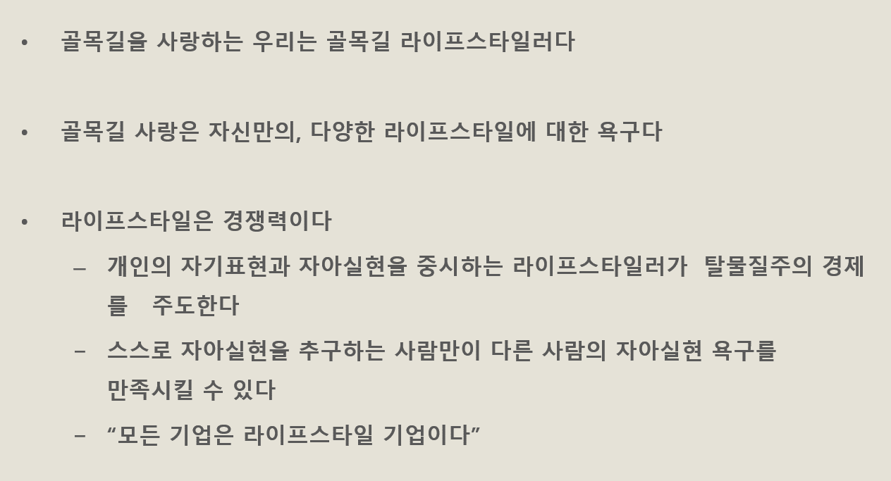 한국 기업은 24시간 편의점, 전자제품 할인마트, 비빔밥 패스트푸드를 라이프스타일 브랜드라고 광고합니다. 젊은 세대가 원하는 라이프스타일을 제안하기보다는 라이프스타일을 유행어로 이용하는 것에 그칩니다.