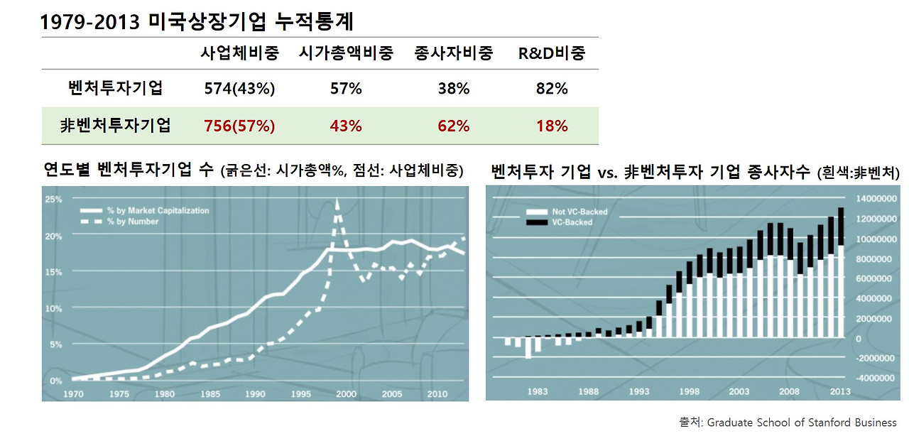 스탠포드 경영대학원 연구에 따르면, 1979년 이후 상장된 기업 중 43%만이 벤처캐피털 지원을 받은 밴처투자기업입니다.