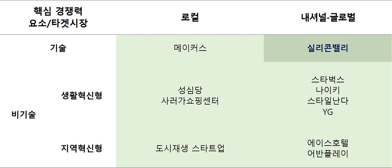 이렇게 핵심 경쟁력과 타켓 시장으로 창업 유형을 분류하면 총 6개의 유형을 도출할 수 있습니다.