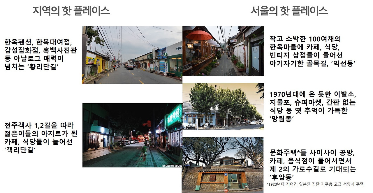 연남/연희, 부암동, 성수동, 한남동 등은 새롭게 부상한 골목상권입니다.
