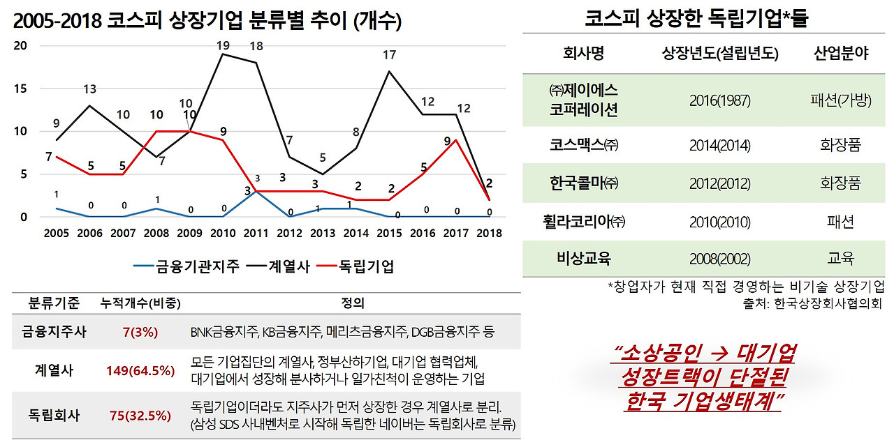 2005년 이후 코스피 상장한 231개 기업 중 75개, 그러니까 상장 기업의 32.5 프로가 독립 기업입니다.