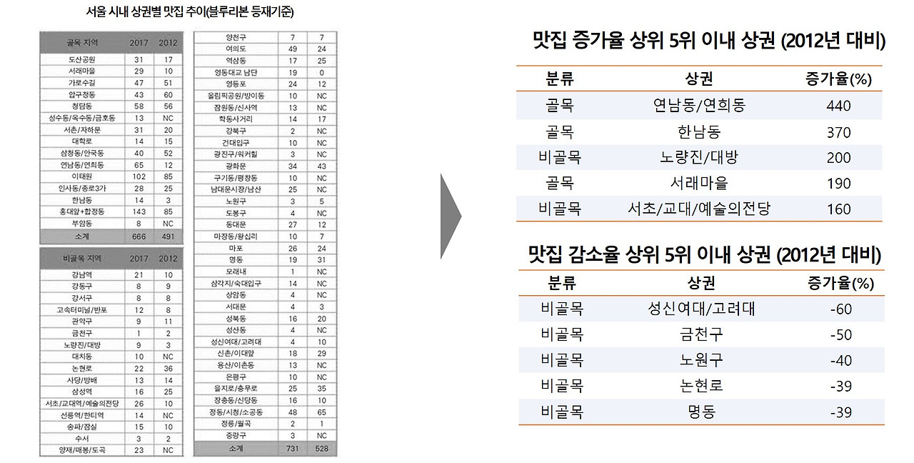 2012-2016년 사이 골목상권 판도가 바뀌었습니다. 압구정동, 삼청동, 가로수길은 맛집 수가 줄었고, 이태원과 홍대는 증가했습니다. 젠트리피케이션 피해를 피해간거죠.