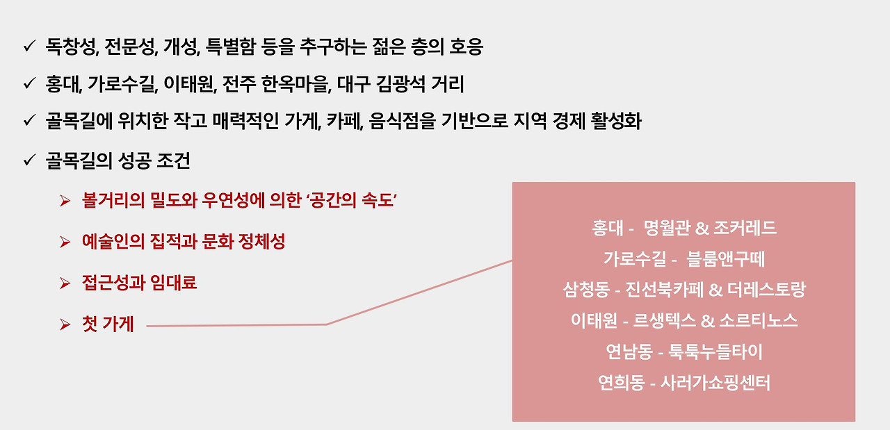 이들 상권 중 일부가 접근성, 공간 디자인, 정체성을 유지하고 개선하면서 성공한 골목상권으로 자리잡습니다.