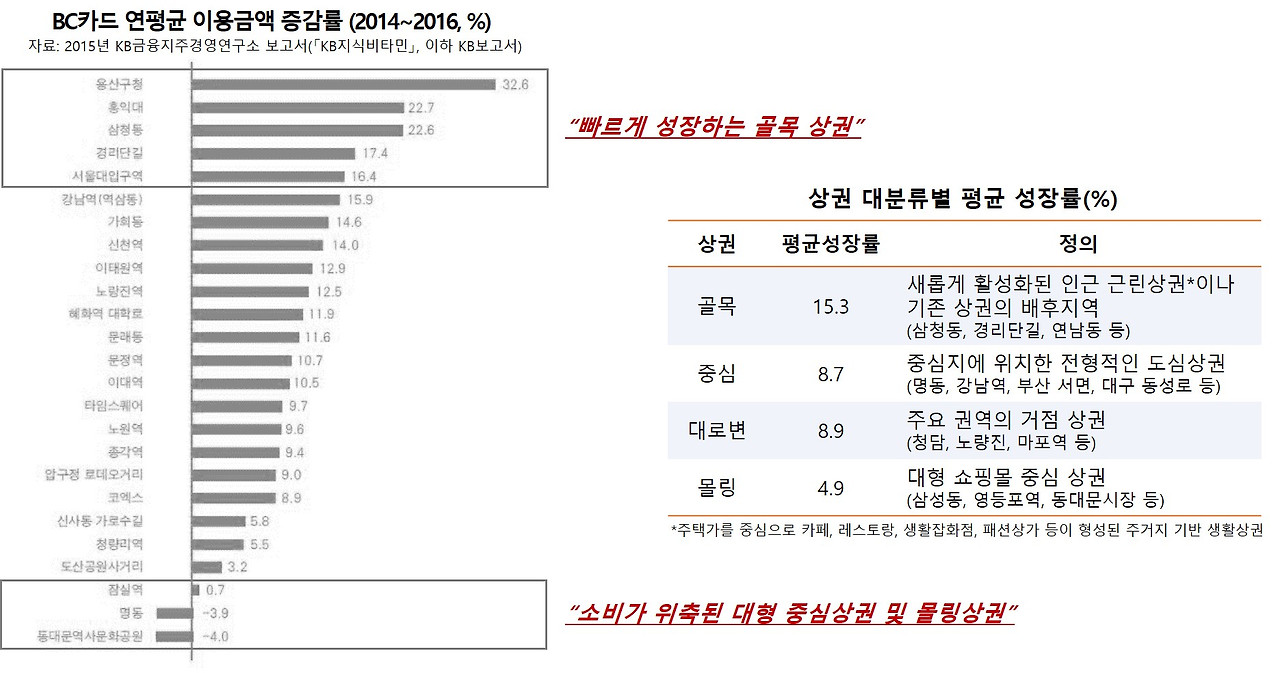BC카드 이용 데이터에 따르면, 2014-2016년 사이 성장률이 가장 높은 상권은 골목상권으로 15.4 프로 성장했습니다.