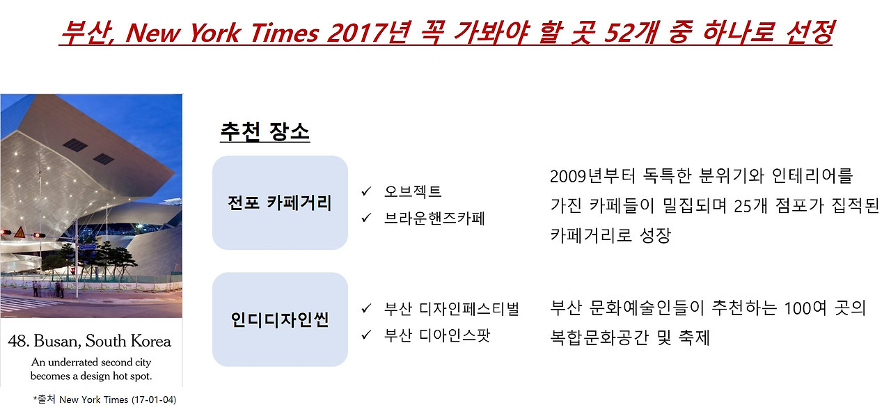 2017년 뉴욕타임스가 국내 지방 도시로는 최초로 부산을 그 해에 꼭 방문해야 할 도시로 추천했는데요, 놀랍게도 부산의 많은 관광지 중 전포카페거리를 추천했습니다.