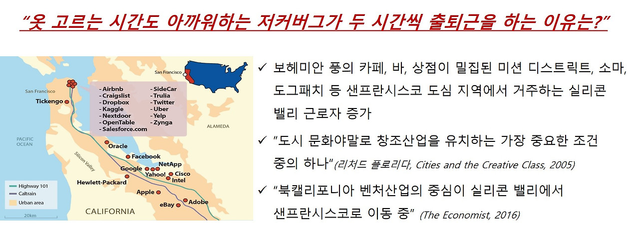젊은이들이 샌프란시스코 도심을 선호하는 바람에 실리콘밸리 기업들이 통근 버스를 운행하고, 새로운 기업은 아예 샌프란시스코에서 창업합니다.