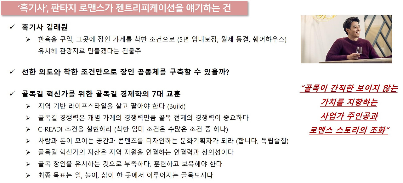 특정 상권의 재생과 개발에 직접 개입하는 것보다, 정부를 대신해 골목상권을 개척할 수 있는 골목 장인을 육성해야 합니다. 골목 장인은 드라마 흑기사 주인공 김래원이 말하는 착한 가게와 기획자가 아닙니다.
