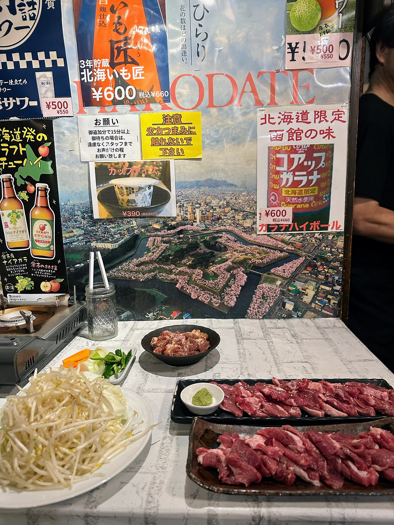 하코다테의 음식 문화는 홋카이도의 신선한 식재료와 일본 전통 요리의 정수를 모두 맛볼 수 있다는 점이 특징이다. 오모5호텔 근처에서 맛본 징기스칸은 홋카이도를 대표하는 향토 음식으로, 이 지역의 신선한 양고기의 품질을 잘 보여준다.