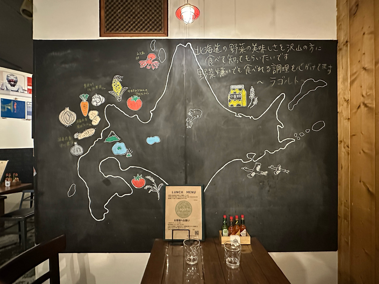 이 온천 마을의 매력은 Lagorto라는 이탈리안 레스토랑에서도 느낄 수 있었다. 입구의 로고부터 호수와 산, 나무를 모티브로 삼아 이 지역의 자연을 표현했고, 벽면의 지도에는 각 지역의 특산물이 그림으로 표시되어 있었다. 와인과 음식을 함께 즐길 수 있는 이곳의 메뉴들은 홋카이도의 신선한 식재료들로 구성되어 있었다. 특히 채소, 해산물, 유제품이 고루 분포된 모습은 이 땅의 다양한 자연환경을 반영하고 있었다.