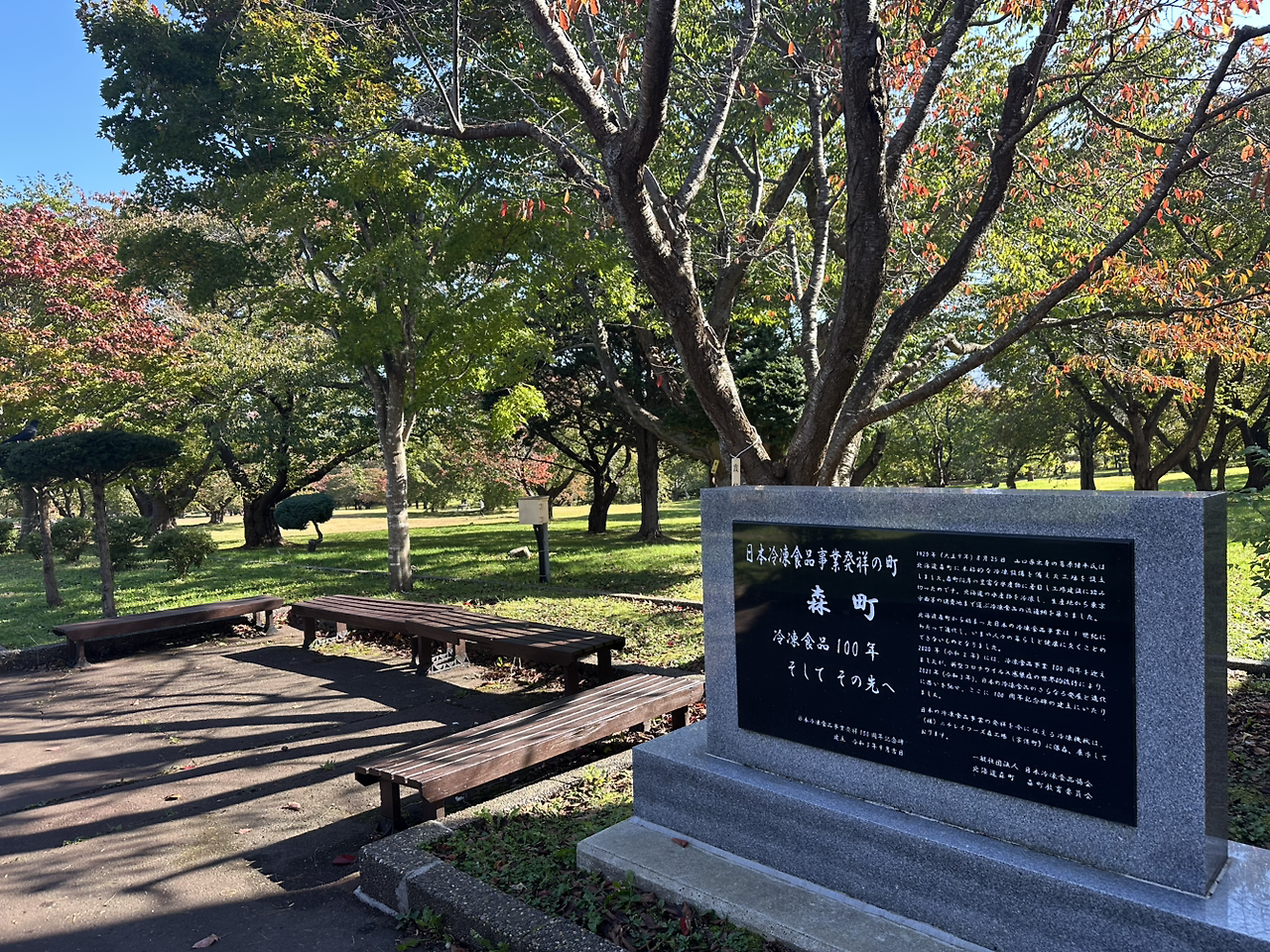 첫 번째 휴게소에서 만난 오니우시 공원은 단순한 쉼터가 아닌, 일본 냉동식품 산업의 역사적 현장이었다. 일본 냉장식품협회가 조성한 이 공원에는 '일본 냉동식품사업의 발상지, 모리마치'라는 비석이 서 있었다. 비석에 새겨진 글귀는 1928년 이곳에서 시작된 냉동식품의 역사를 담담히 전하고 있었다. 100년이 넘는 시간 동안 이어져 온 이 산업의 발자취가, 오늘날 일본이 세계적인 수산강국으로 성장하는 토대가 되었음을 알 수 있었다. 단풍이 물들기 시작한 나무들 사이로 스며드는 늦가을 햇살 아래, 현대 일본 냉동식품의 시작을 알린 이 작은 마을의 이야기를 되새겨보는 시간이었다.