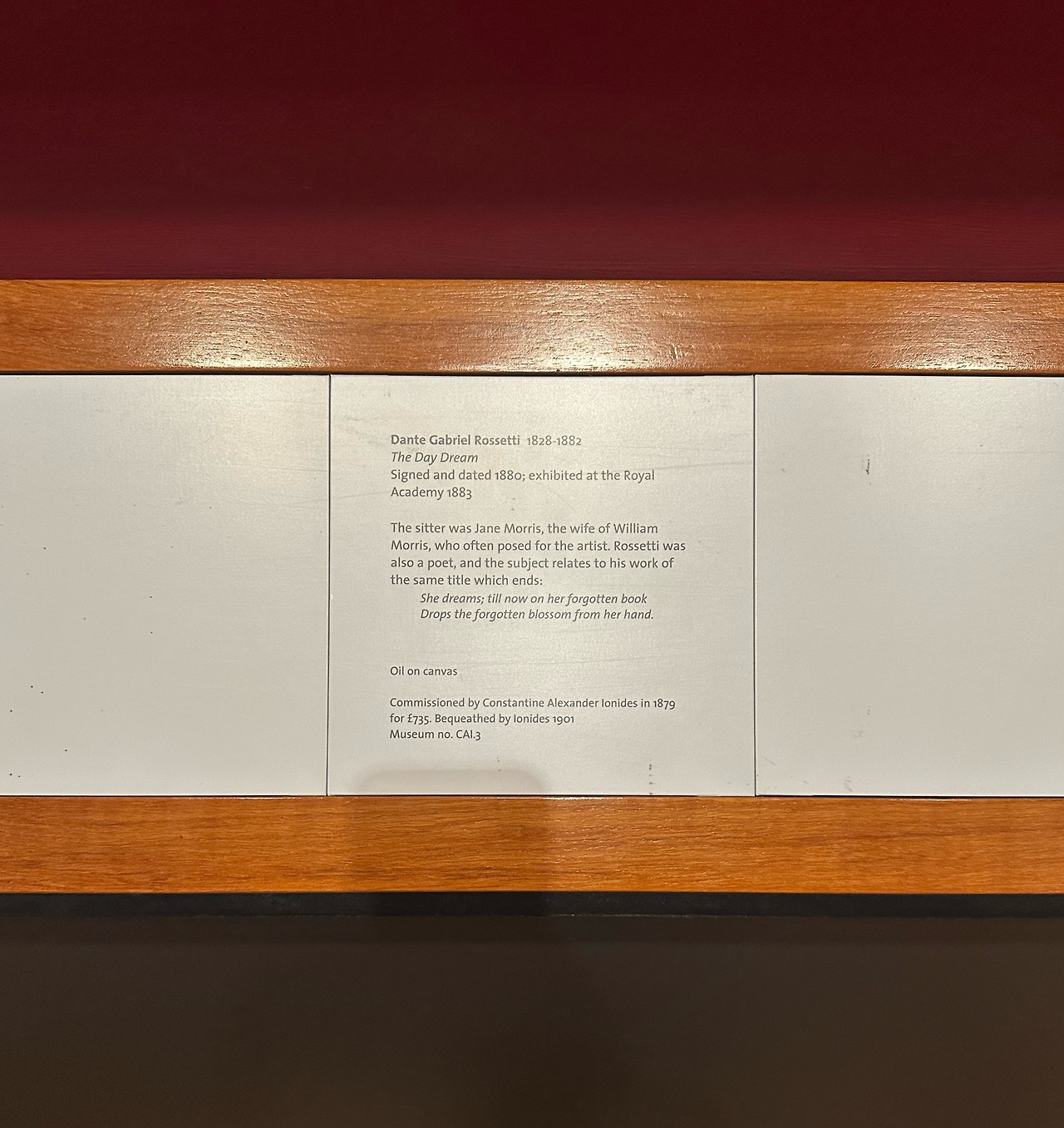 모리스의 결혼관과 그의 선택에 대해서는 앞으로도 많은 논의가 이어질 것이다. 하지만 전시장을 돌아보며 그의 대응이 현명했다는 생각이 들었다. 그가 제인과 로세티의 관계에 대해 공개적으로 분노하거나 복수하지 않았기에, 이 사건은 그의 인생에서 하나의 각주로 남을 수 있었다. 모리스의 결혼생활은 그의 인생 전체를 지배하는 서사가 되지 않았고, 그래서 우리는 지금도 예술가이자 사회 사상가로서 모리스의 더 큰 이야기를 이야기할 수 있다.