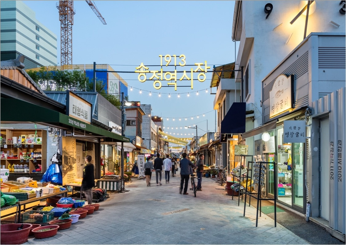 광주 송정역 시장은 현대카드가 광주 문화기획사 컬쳐네트워크와 함께 진행한 대표적인 전통시장 재생 프로젝트 중 하나다. 무드매니지먼트 관점에서 거리환경을 조성하고 파사드를 디자인한 건축환경 혁신 사례다. 구체적으로, 송정역 대합실이라는 상징적 건물을 중심으로 100년의 역사를 가진 이 시장은 현대카드의 디자인, 스토리, 경험 중심의 재생 전략을 통해 새롭게 탈바꿈했다.
