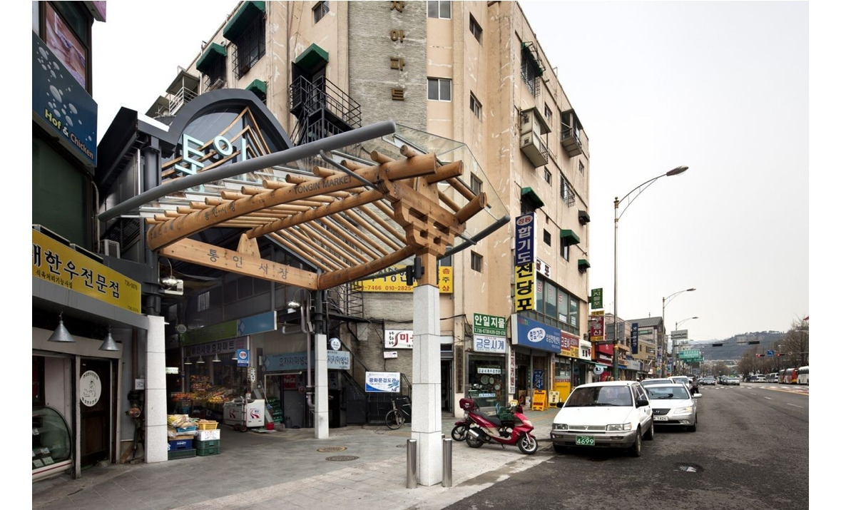 서울 종로구 통인시장의 '아트게이트'는 디자인을 통해 전통시장의 정체성을 강화하고 가치를 창출한 선구적 사례다. 2011년 설계를 시작해 2012년 봄에 완공된 이 구조물은 한옥의 목구조를 현대적으로 재해석하여 소나무와 철을 결합한 독특한 '목철 샌드위치 구조'로 제작되었다.