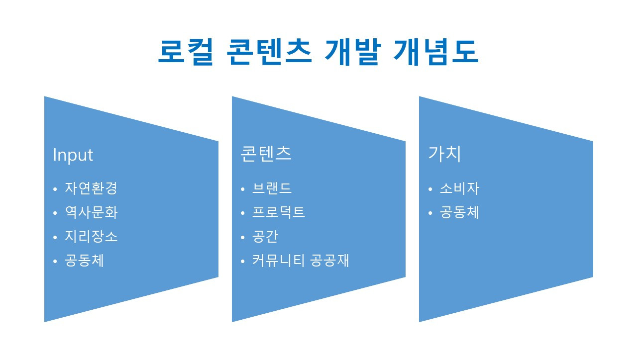 콘텐츠를 이렇게 정의하면 로컬 콘텐츠의 의미는 명확해진다. 로컬 콘텐츠는지역 자원에서 추출된 콘텐츠다. 환경, 역사, 문화, 공동체, 지리, 장소등의 지역 자원이 로컬 콘텐츠 생산 과정에서 인풋(input, 투입재)으로 투입된다.