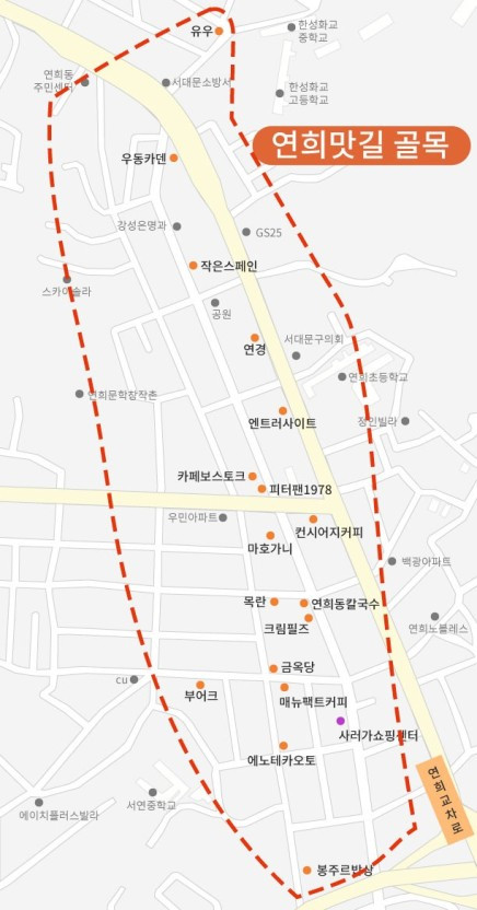 연희동에서 가장 활성화된 상권인 사러가 지구(연희1동)는 이런 배리어 프리 동선의 좋은 예시다. 이 지역은 큰 장애물 없이 동선이 바둑판같은 격자형 구조를 이루고 있다. 이 격자형 구조는 보행자가 다양한 경로를 선택할 수 있게 하며, 상권이 유기적으로 연결되게 한다.