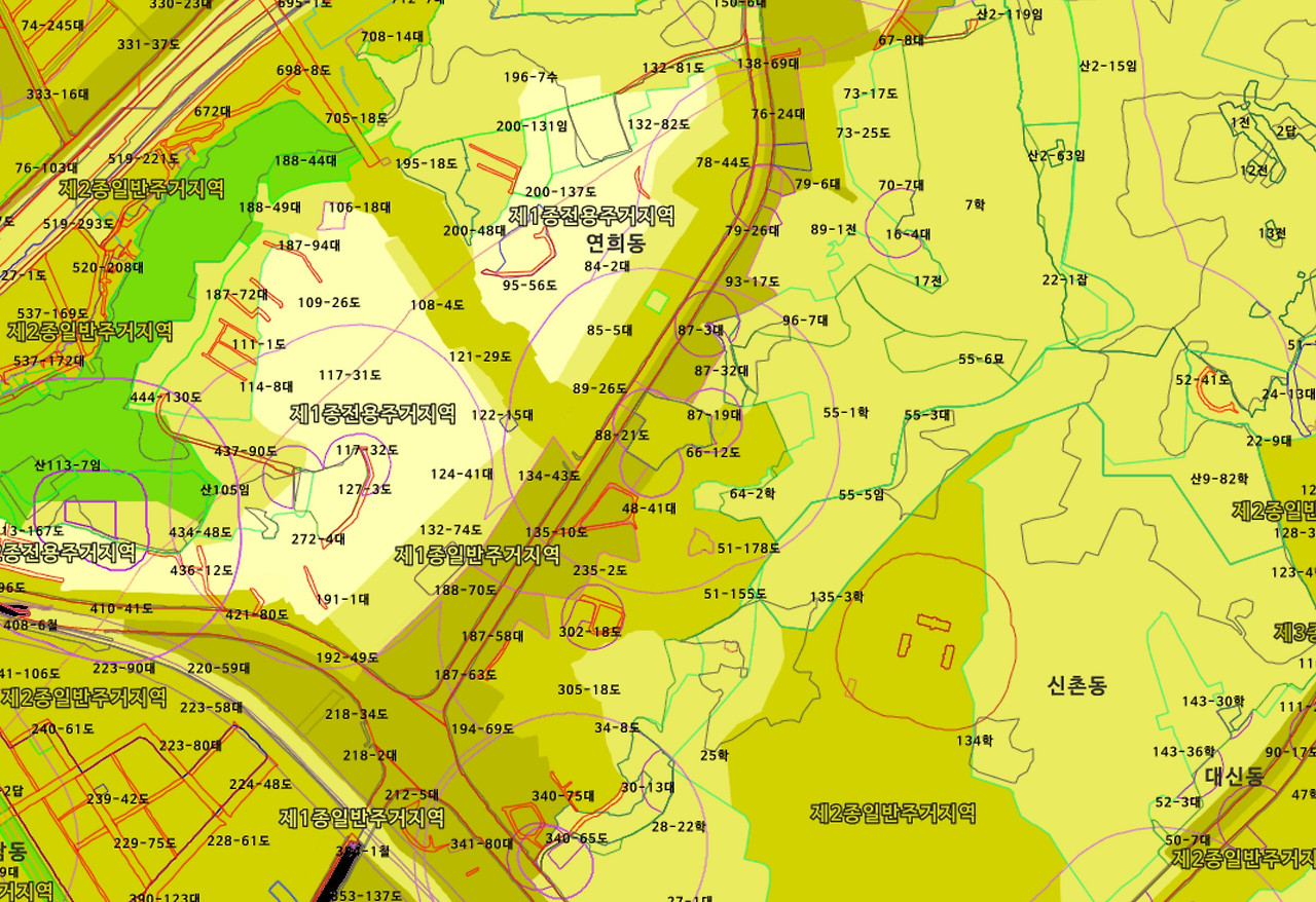 용도지역 측면에서 연희동은 대부분 주거지역으로 지정되어 있다. 주택가는 제1종 주거전용지역, 근린상가 구역은 제1종 또는 제2종 일반주거지역으로 지정되어 있다. 이러한 용도지역 지정은 대규모 상업시설의 입지를 제한하고 주거 환경을 보호하는 역할을 하며, 소규모 근린 상업시설 중심의 상권 발전을 유도한다.