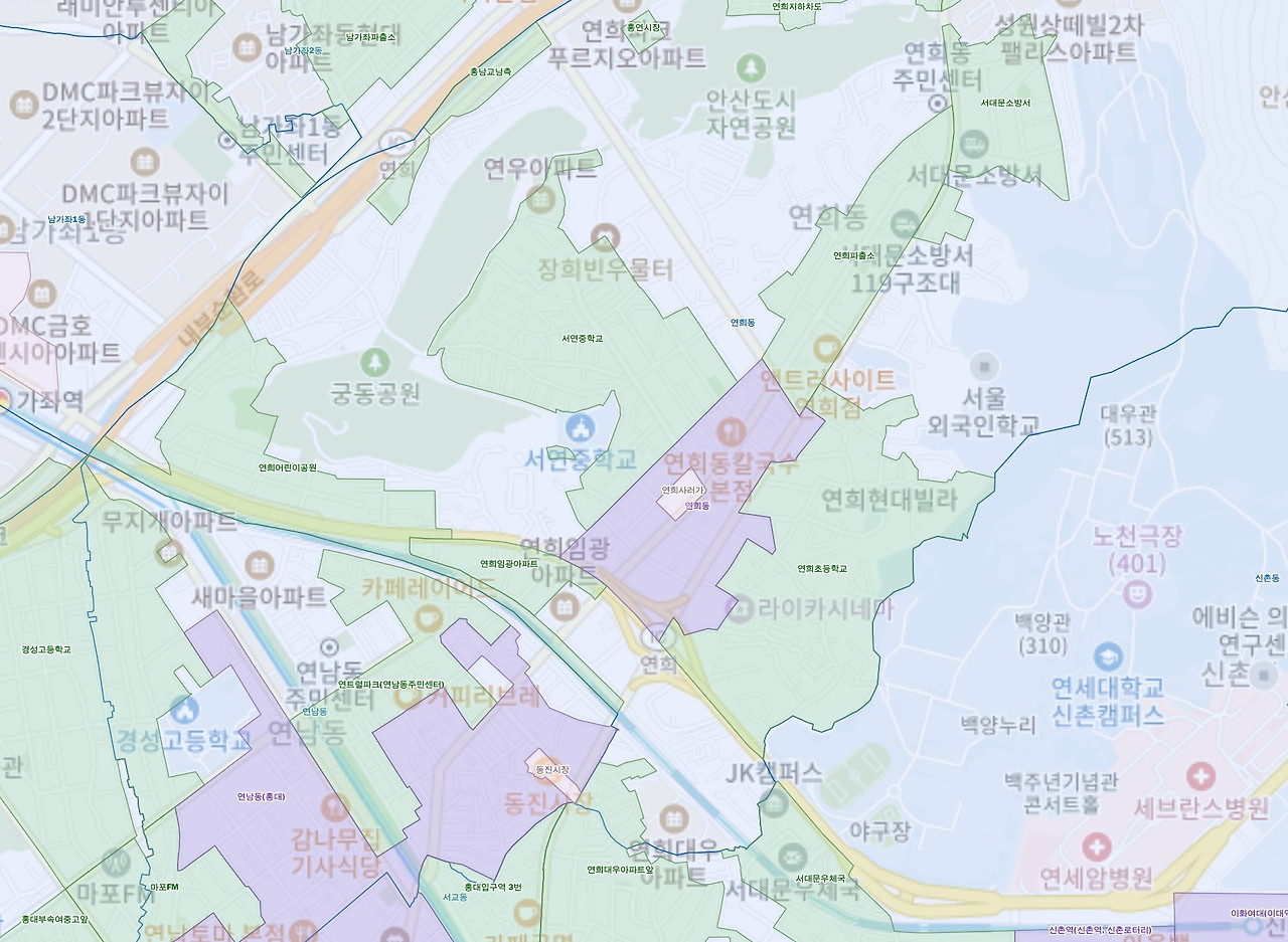 중간 밀도(3-4층): 연희동을 둘러싼 주거지역은 적정한 인구 밀도를 유지하며, 이는 상권에 안정적인 소비자 기반을 제공한다. 또한 연세대학교와 외국인학교의 존재는 추가적인 유동인구를 창출한다. 적절한 밀도는 다양한 업종의 경제적 생존을 가능하게 하며, 이는 상권의 다양성과 지속가능성을 지원한다.