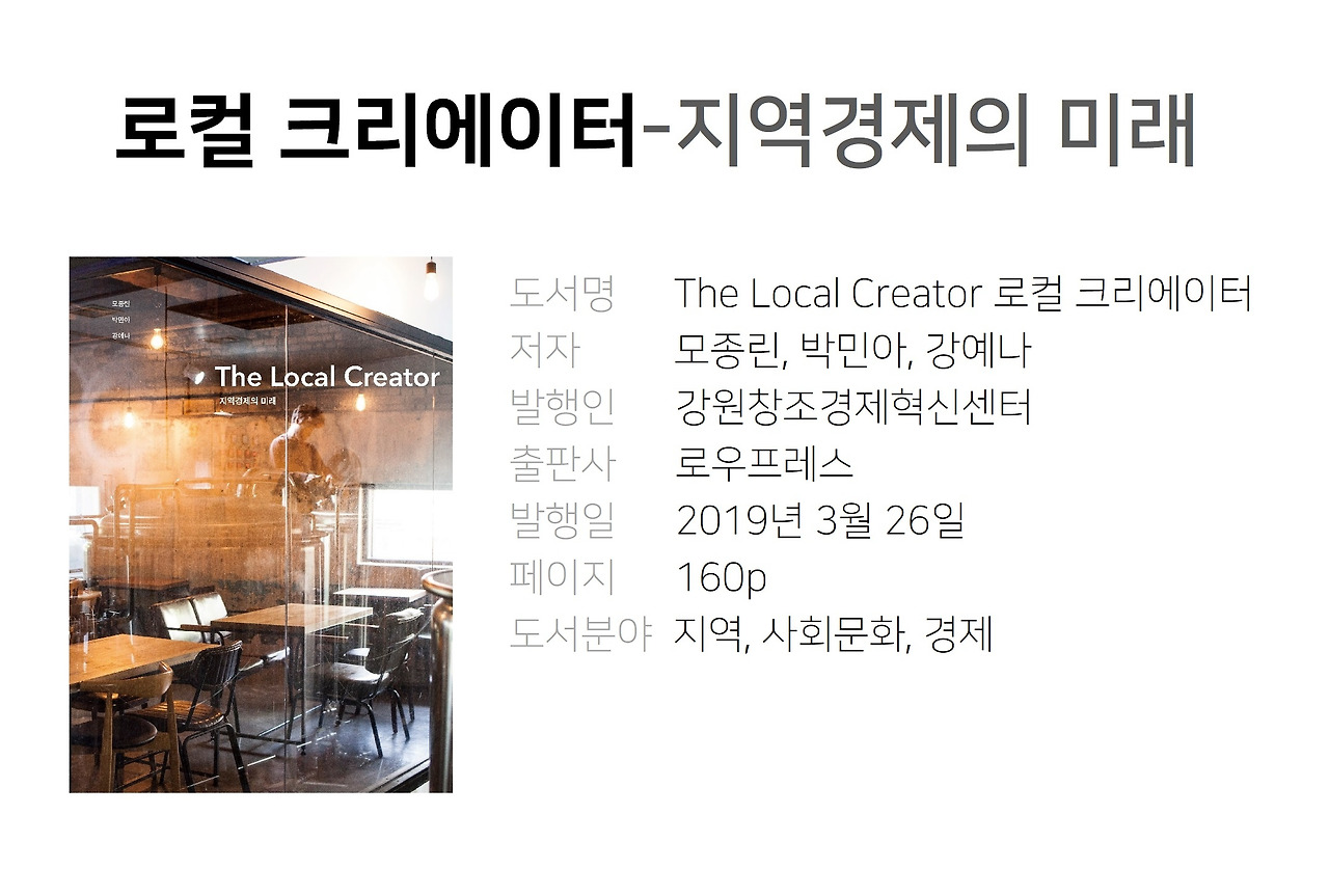 <로컬 크리에이터-지역경제의 미래>는 강원도 구석구석에서 지역 생활 문화를 기반으로 지역 문화를 만들어가는 로컬 크리에이터를 소개하는 한편 이들을 통해 지역 경제가 살아나는 과정을 설명하는 연구서다. 이 책의 출판이 학계가 로컬 크리에이터 연구를 본격적으로 시작하는 계기가 되기를 기대한다.