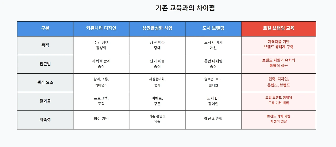로컬 브랜딩 개념과 전략에 대한 해석이 다양하지만, 로컬 브랜드 생태계 구축을 위한 로컬 브랜딩은 목표와 내용에서 다른 교육과정과 달라야 한다. 단순한 지역 홍보나 마케팅, 로고나 슬로건 제작에 그치지 않고, 실제 로컬 브랜드를 발굴하고 육성하여 지역 고유의 브랜드 가치를 구현하는 것이 핵심이다. 브랜딩 교육이 쉽게 빠질 수 있는 "브랜드 없는 브랜딩" 교육을 지양한다. 로컬 브랜드 기반 로컬 브랜딩은 개별 사업체의 성공을 넘어 지역 전체가 하나의 브랜드로 작동하는 생태계를 만드는 것으로, 기존의 커뮤니티 디자인이나 지역활성화 접근법과는 근본적으로 다른 관점을 요구한다.