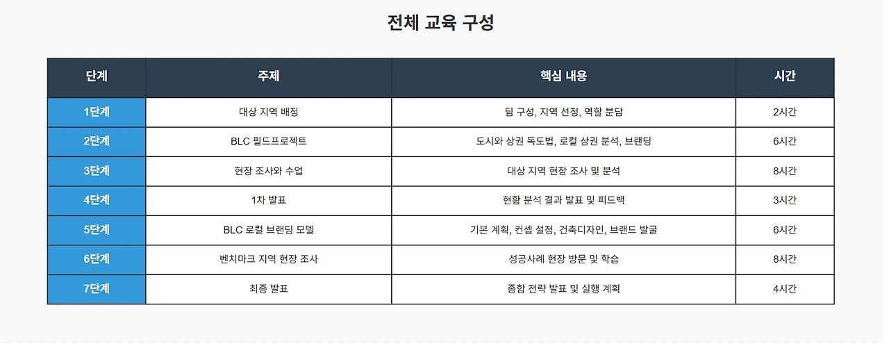 기대 효과 이 7단계 교육 과정을 통해 참여자들은 이론과 실습을 병행하며 실제 지역을 대상으로 한 구체적이고 실행 가능한 로컬 브랜딩 전략을 수립하게 된다. 특히 현장 조사와 벤치마크 지역 방문을 통해 현실적이고 차별화된 전략을 도출할 수 있으며, 교육 종료 후에도 지속적인 실행이 가능한 기반을 마련할 수 있다.