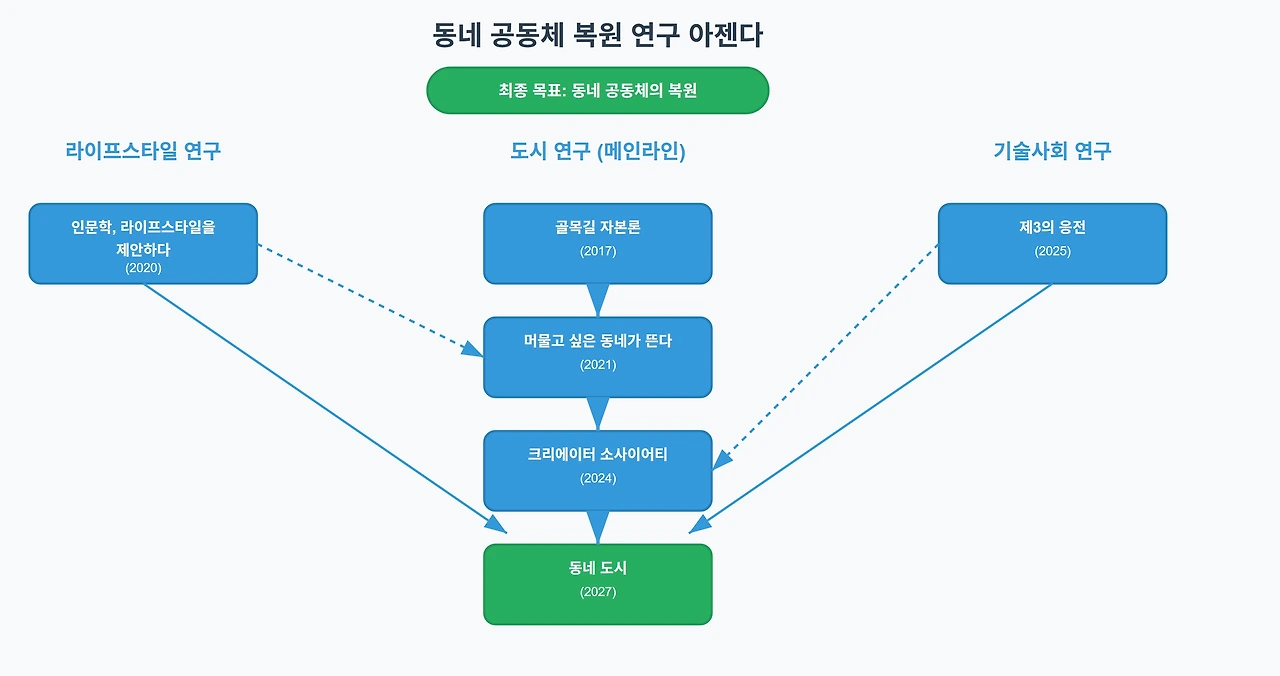 10년간 한 방향으로 일관되게 진행한 연구 계획입니다. 개별 저작들이 아니라 하나의 통합된 논증 구조를 이루고 있습니다. 동네 골목을 걸으며 시작한 질문이 어느새 이렇게 10년 작업이 되었습니다.